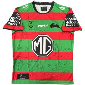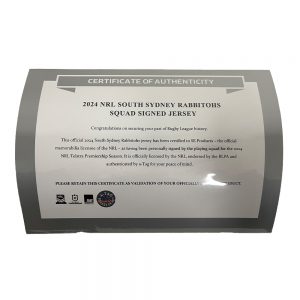 Personally signed by the South Sydney playing squad* for the 2024 NRL Telstra Premiership, each jersey comes officially licensed and endorsed by the NRL. It is a must-have for all Rabbitohs fans and collectors alike – don’t miss out, secure yours before this limited stock runs out!