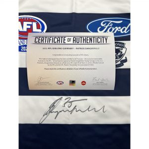 - Officially licensed Geelong Cats Premiers guernsey, personally signed by Premiership superstar Patrick Dangerfield