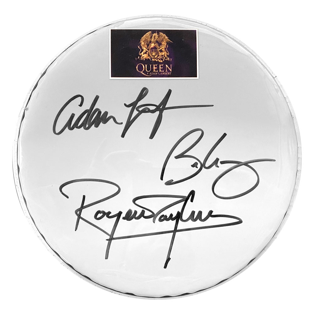- Red Transparent Drumskin hand signed by members of Queen: Adam Lambert, Brian May & Roger Taylor