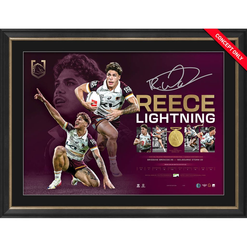 - Features a piece of match-used final series ball with a replica Clive Churchill medal alongside premiership statistics and a iconic imagery capturing Reece Walsh’s celebration.