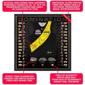 - Features an officially licensed Richmond 2020 Grand Final guernsey, personally signed by every single 2017, 2019 & 2020 Premiership player, along with three-time Premiership coach Damien Hardwick – an impressive 30 signatures in totality