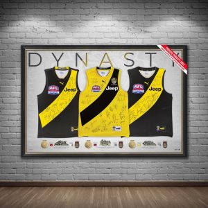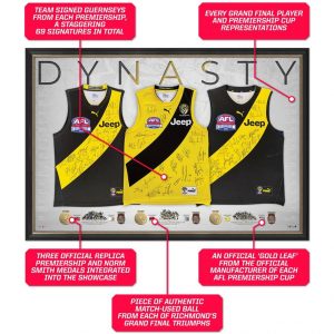- Features an officially licensed Richmond 2017, 2019 and 2020 Grand Final guernsey – a guernsey from each Grand Final triumph – personally signed by every single Premiership player from each respective year, along with three-time Premiership coach Damien Hardwick – a staggering 69 signatures in totality