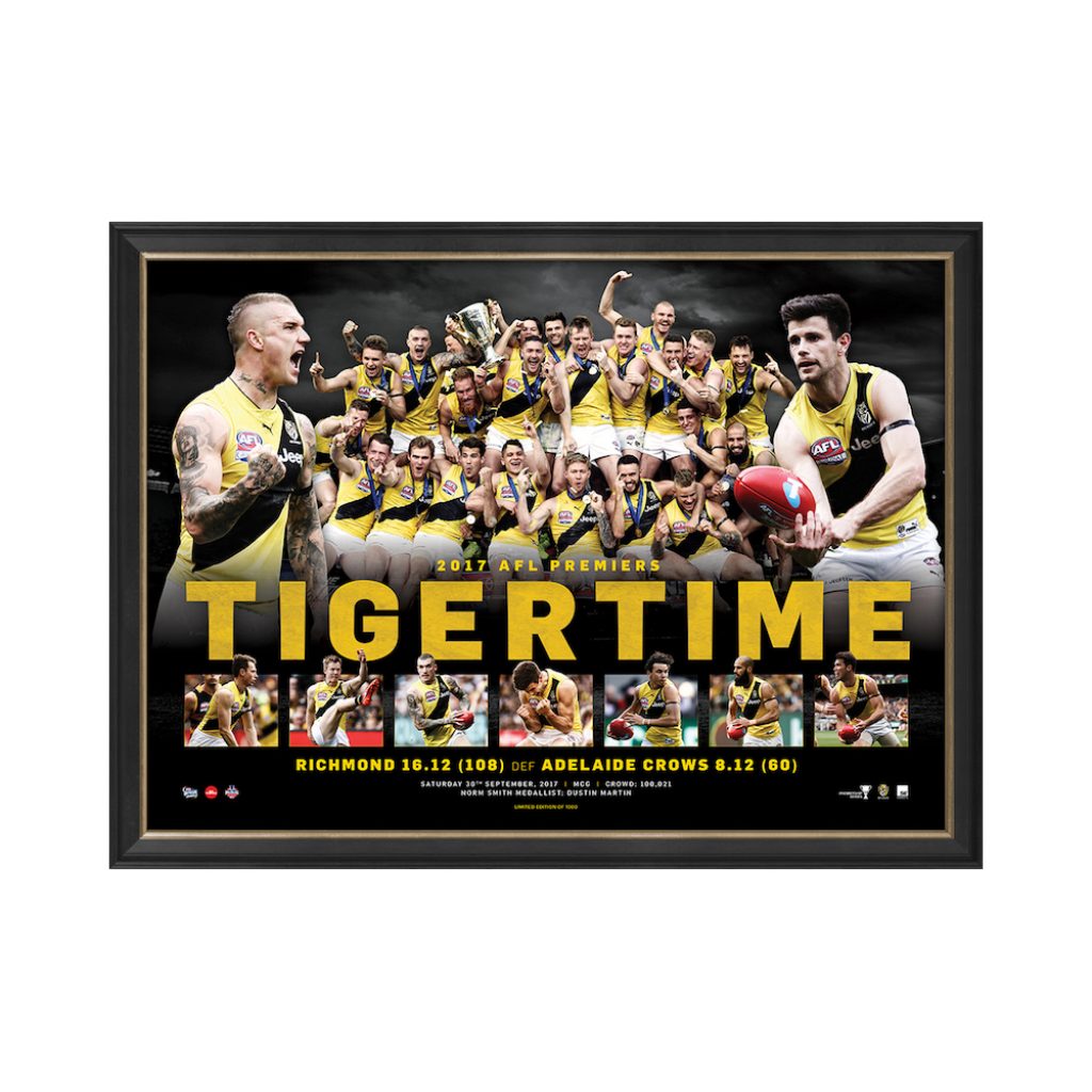 Categories: 2017 AFL Premiers, AFL, Richmond Tigers Tags: 2017, AFL, Final, Framed, Grand, Premiership, Richmond, Sportsprint, Tiger, Tigers, Time