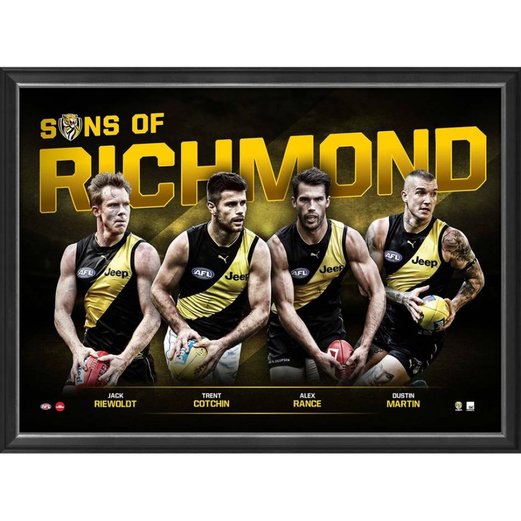Taylor Made Memorabilia, are proud to release the Sons of Richmond Multiplayer Sportsprint. Featuring four of Richmond’s most loved Premiership stars – Jack Riewoldt, Trent Cotchin, Alex Rance and Dustin Martin – Sons of Richmond comes officially licensed and endorsed by AFL and AFLPA. This beautifully presented sportsprint serves as the perfect gift for any Tigers fan, so don’t miss out – secure yours before stock runs out!