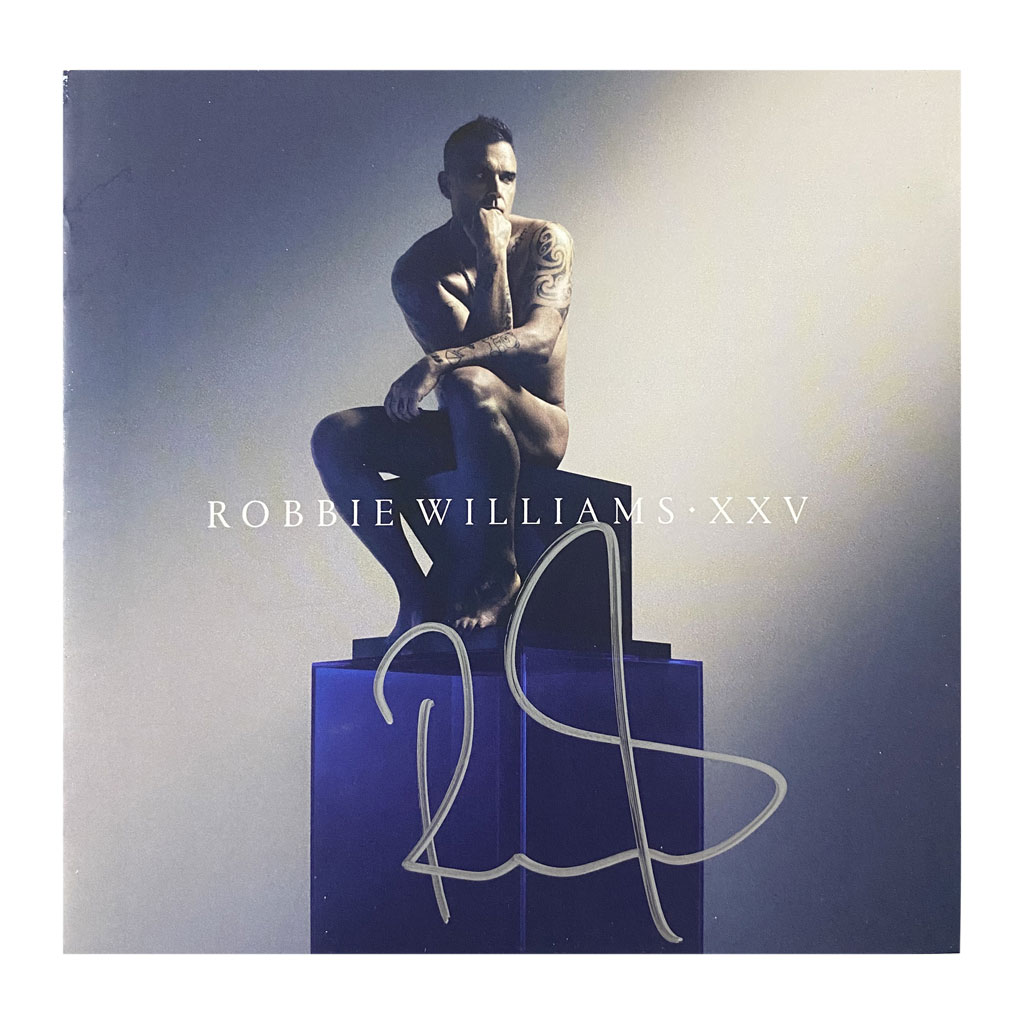 • XXV CD 12cm x 12cm art card hand signed by Robbie Williams