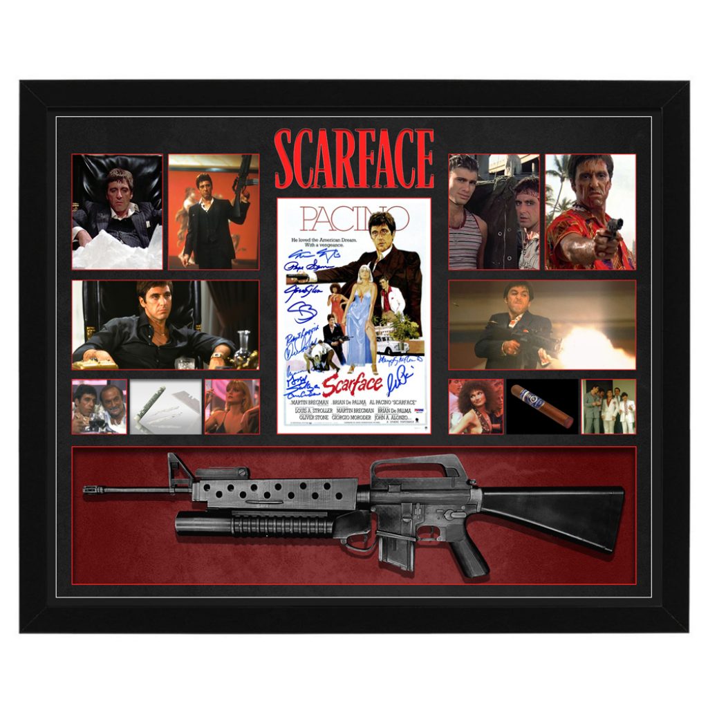 - Photograph is mounted in a deluxe display along with photos from Scarface, replica cocaine, money, blade & cigar as well as a full size replica machine gun