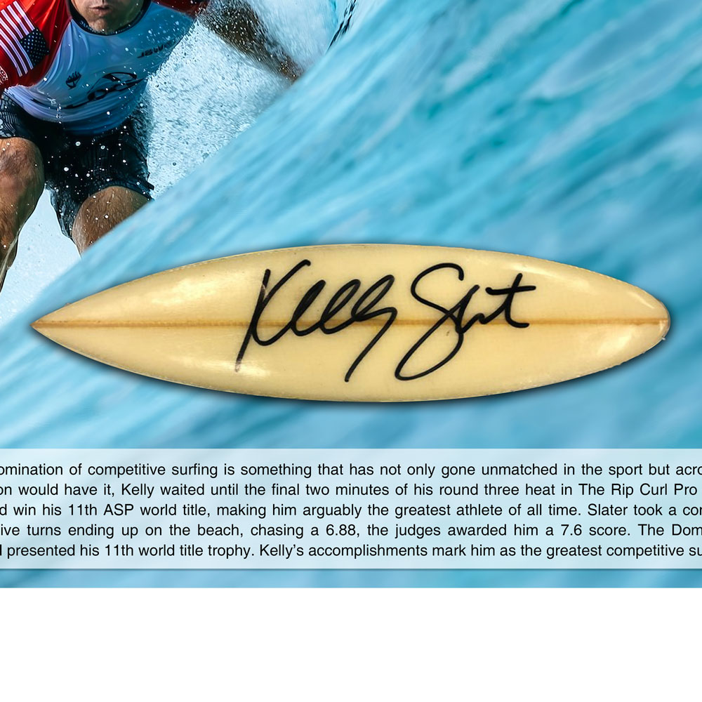 • Miniature 30cm Surfboard hand signed by Kelly Slater and mounted onto a deluxe print showcasing Kelly Slater’s domination as an ASP World Champion