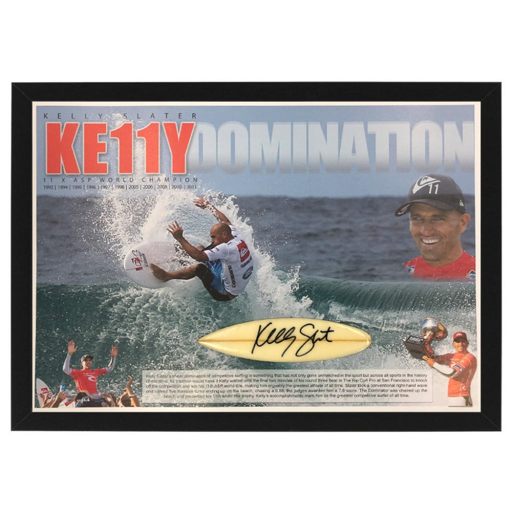 - Miniature 30cm Surfboard hand signed by Kelly Slater and mounted onto a deluxe print showcasing Kelly Slater’s domination as an ASP World Champion