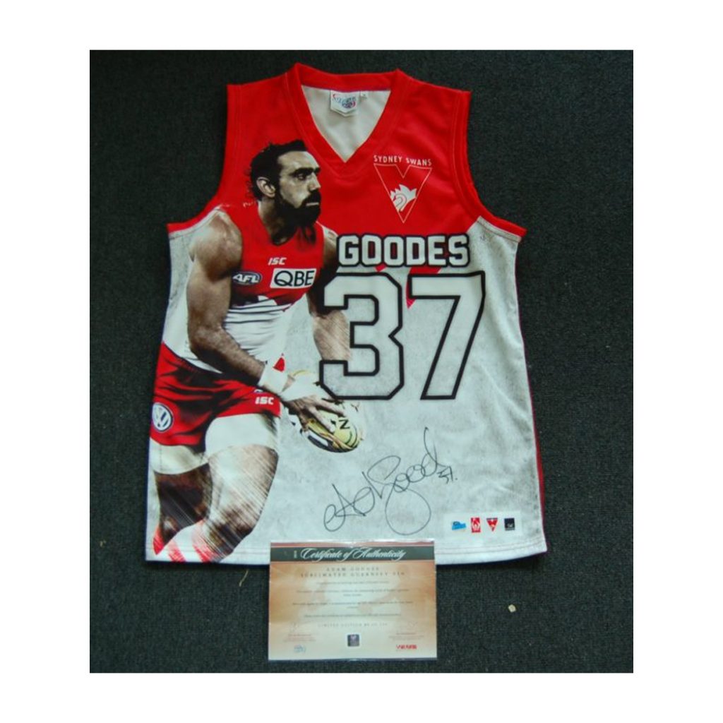- Uniquely designed AFL guernsey personally signed by Sydney star Adam Goodes