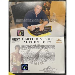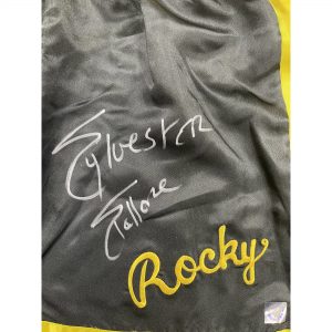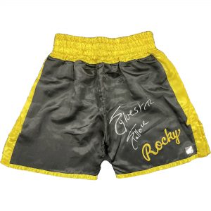 - Officially licensed replica Rocky II Black/Yellow Trunks hand signed by Sylvester Stallone
