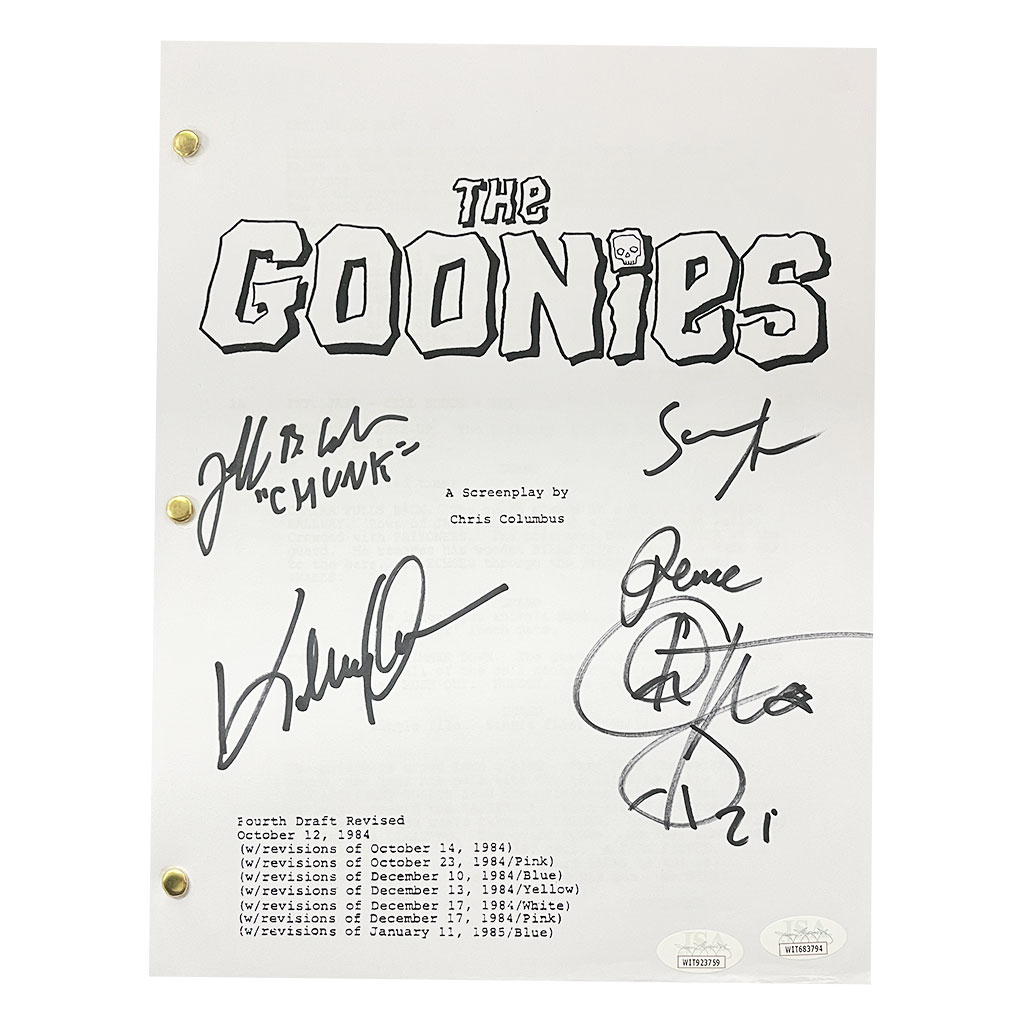 • The Goonies full movie script hand signed Sean Astin, Corey Feldman, Jeff Cohen & Ke Huy Quan