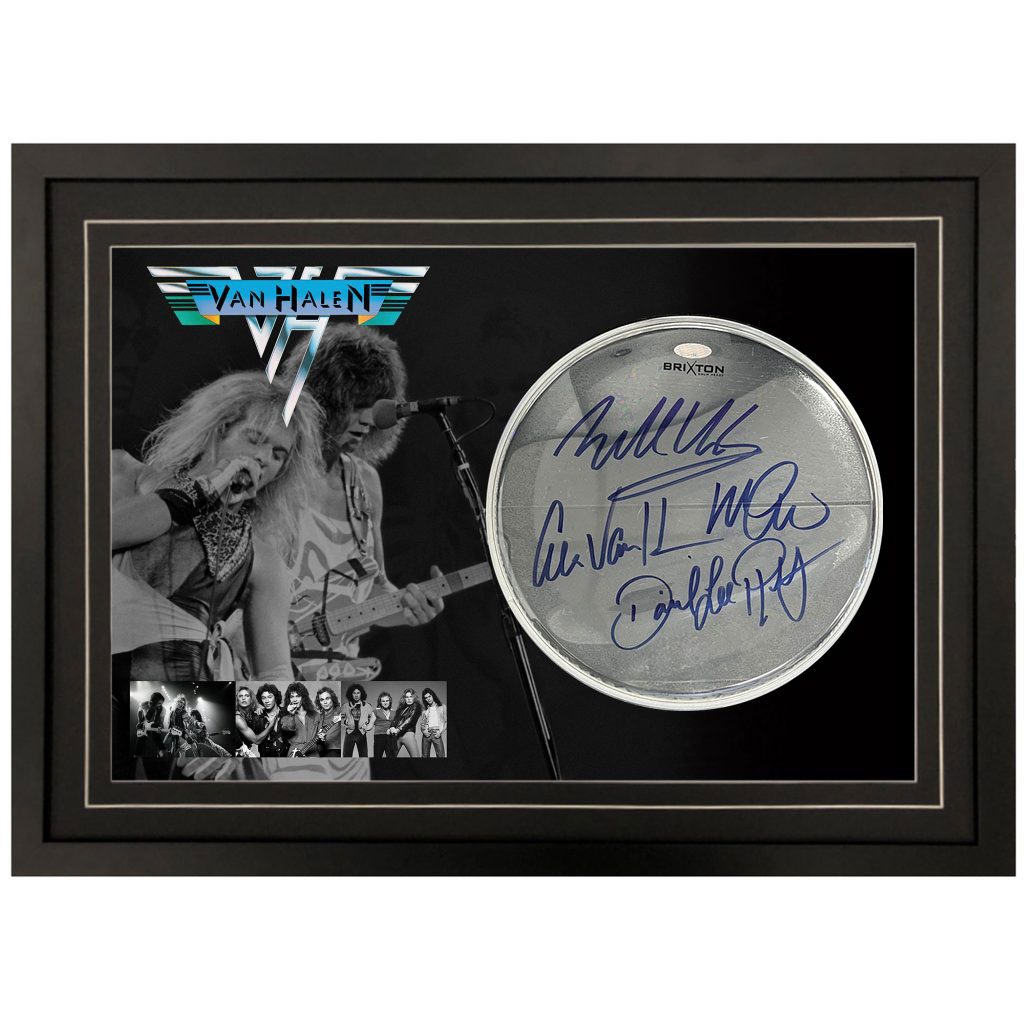 - 27cm transparent clear Drumskin hand signed by members of Van Halen: David Lee Roth, Eddie Van Halen, Alex Van Halen & Michael Anthony